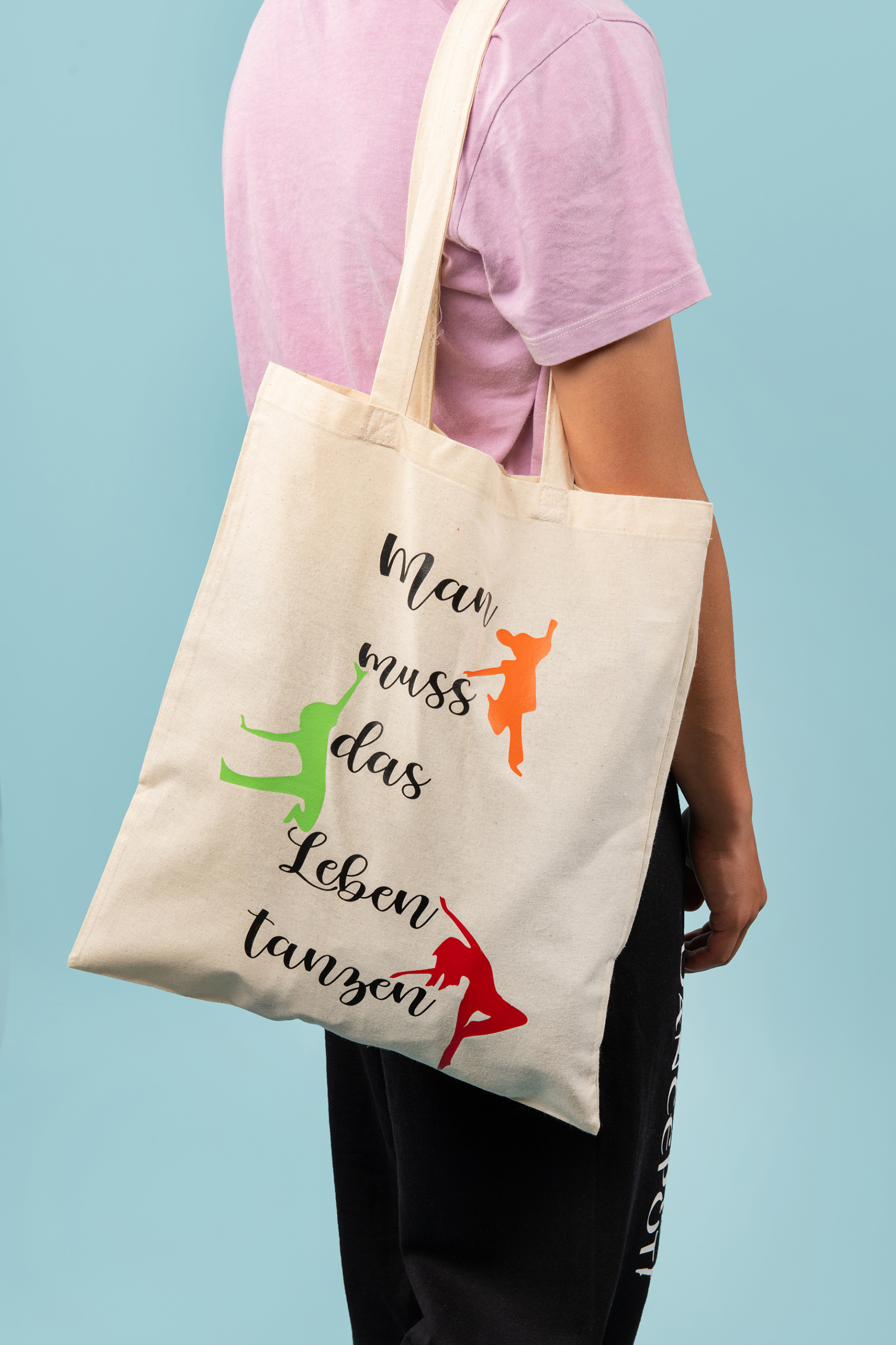 1 Baumwolltasche mit Druck farbiger Tanzfiguren / grauen Schrift
